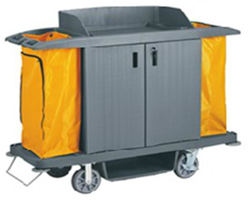 Carro de hotelaria fechado c/ portas, 2 prateleiras e chave. Material: polipropileno e sacos em vinil.