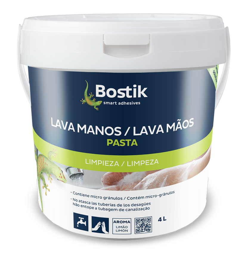 Massa lava mãos BOSTIK com microgrânulos abrasivos solúveis em água. Não contém areia. Perfume agradável a limão. Peso 4 KG.