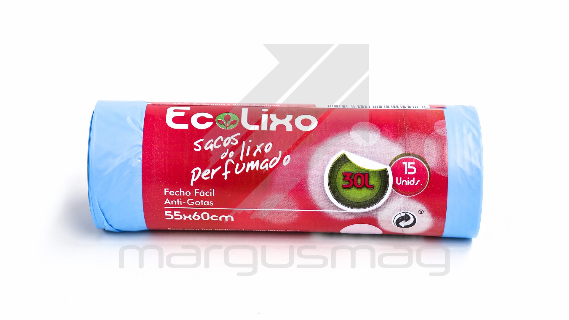 Saco plástico azul perfumado para lixo com fecho fácil. Embalagem de 15 unidades.