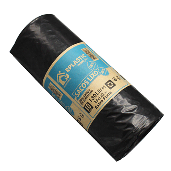Saco plástico preto muito resistente para lixo. Ideal para lixo urbano e pesado – GG170 Rolo com 10 sacos. Largura 80 cm, comprimento 120 cm.