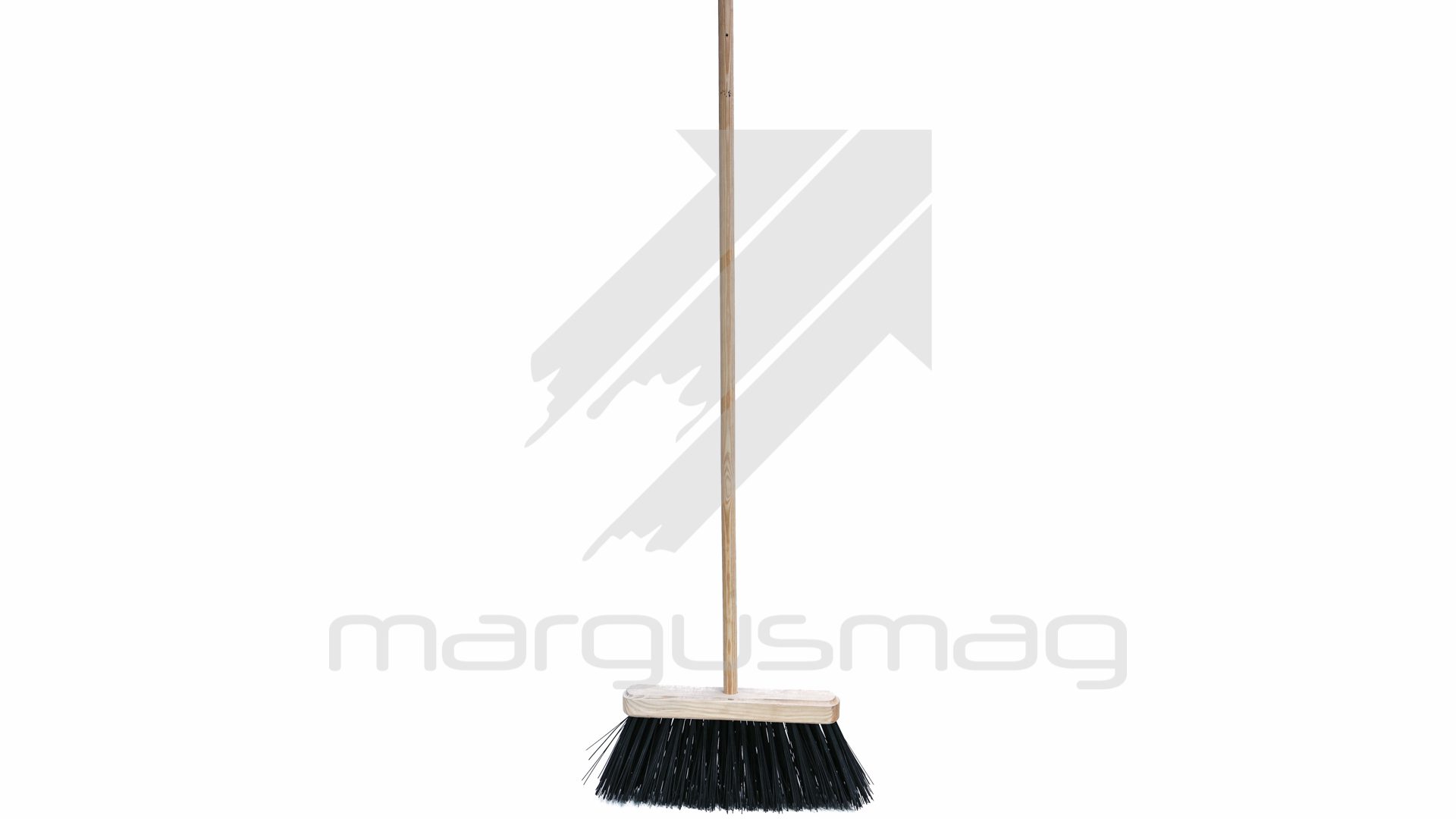 Vassoura industrial grande em nylon duro com cabo de madeira. Utilizado para varrer pavimentos industriais, fim de obras, cimento, asfalto, cerâmica, grandes áreas, entre outros.